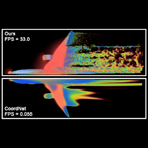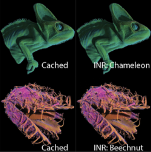 A GPU-accelerated framework that enables fast, interactive visualization of implicit neural representations (INRs) for massive scientific datasets. It uses a scalable, multi-resolution cache to minimize redundant inference steps to achieve a 5× speedup over state-of-the-art INR rendering. This allows tera-scale datasets to be explored on consumer-grade hardware after in situ compression on high-performance systems.