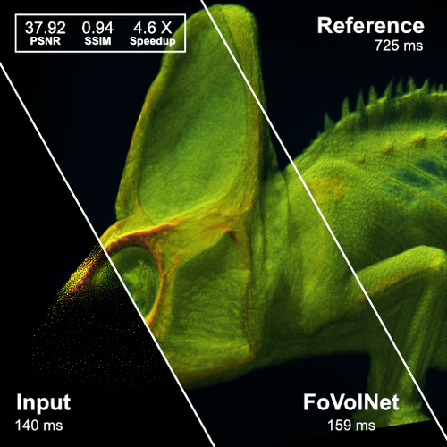 A neural reconstruction method for sparse foveated rendering achieving high-quality, interactive results for volume visualization. By sparsely sampling around the user's focal point and reconstructing the frame with a compact neural network, it saves computation time while maintaining perceptual quality. FoVolNet outperforms state-of-the-art neural reconstruction techniques in both speed and visual fidelity.